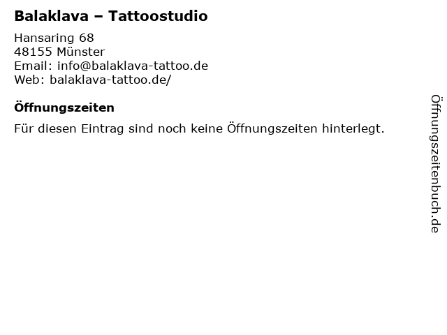 | Öffnungszeiten Balaklava – Tattoostudio in Münster anzeigen | |