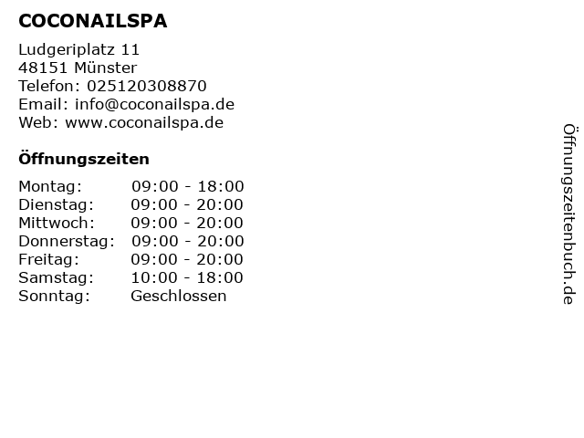 | Öffnungszeiten COCONAILSPA in Münster anzeigen | |