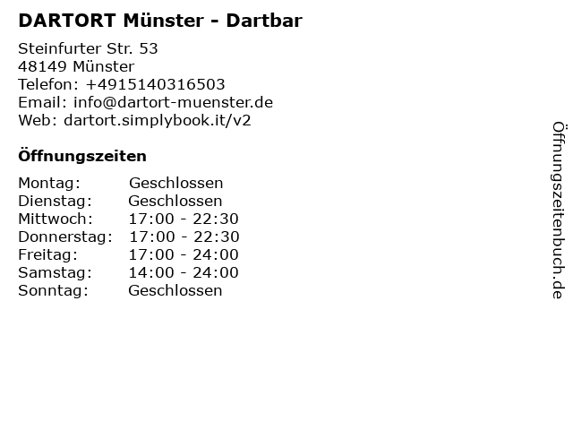 | Öffnungszeiten DARTORT Münster - Dartbar in Münster anzeigen | |