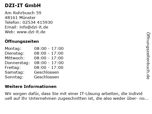 | Öffnungszeiten DZI-IT GmbH in Münster anzeigen | |