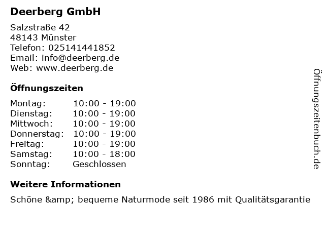 | Öffnungszeiten Deerberg GmbH in Münster anzeigen | |