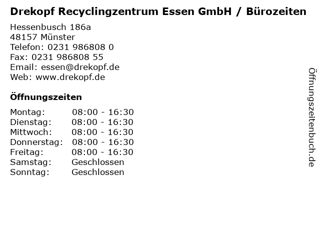 Branchen & Suchbegriffe zu Drekopf Recyclingzentrum Essen GmbH / Bürozeiten:bürozeiten, drekopf, elektroschrott, entsorgungen, essen, recyclinghof, recyclingzentrum, schrotthof |
