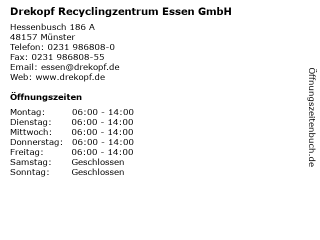 1 Drekopf Recyclingzentrum Essen GmbH / Bürozeiten (Entfernung: 0,10 km) Hessenbusch 186a, 48157 Münster 5 6 |