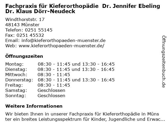 3 Fachpraxis für funktionelle und plastische HNO-Chirurgie (Entfernung: 0,78 km) Bült 13, 48143 Münster 5 Dr. med. dent. Dorothea Endler - Fachzahnärztin für Kieferorthopädie (Entfernung: 1,06 km) Hohenzollernring 59, 48145 Münster 6 |