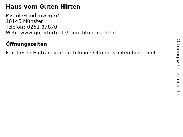 | Öffnungszeiten Haus vom Guten Hirten in Münster anzeigen | |