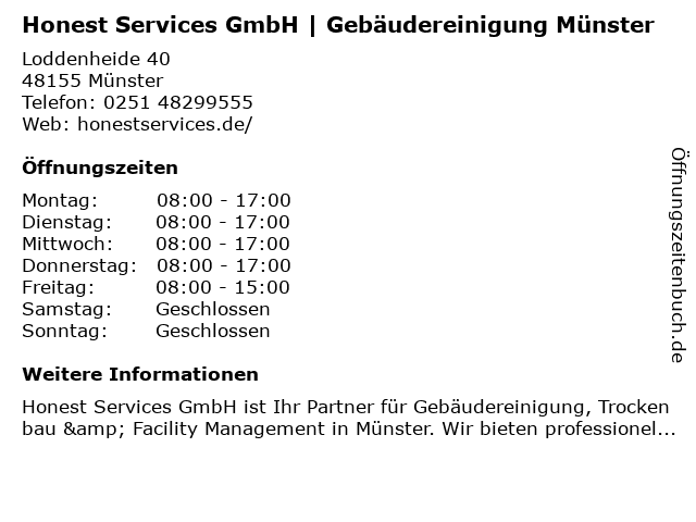 Branchen & Suchbegriffe zu Honest Services GmbH | Gebäudereinigung Münster:fensterreinigung, gebäudereinigung, hausmeisterdienst, honest, service für schneebeseitigung, services, trockenbau |