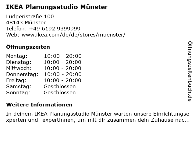 | Öffnungszeiten IKEA Planungsstudio Münster in Münster anzeigen | |