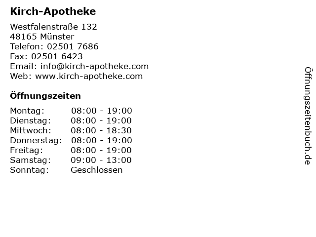 | Öffnungszeiten Kirch-Apotheke in Münster anzeigen | |