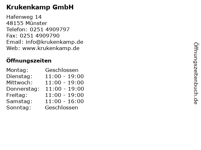 | Öffnungszeiten Krukenkamp GmbH in Münster anzeigen | |