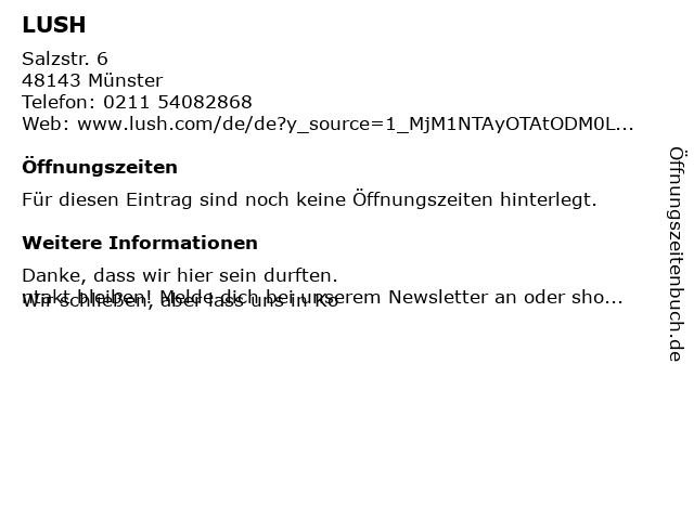 | Öffnungszeiten LUSH in Münster anzeigen | |