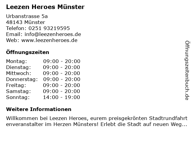 | Öffnungszeiten Leezen Heroes Münster in Münster anzeigen | |