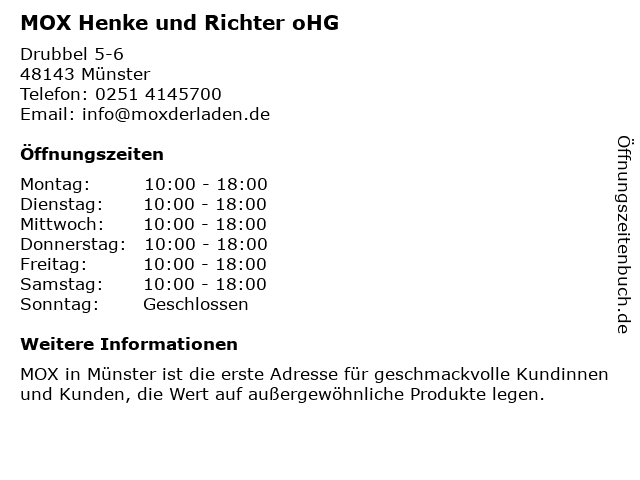 | Öffnungszeiten MOX Henke und Richter oHG in Münster anzeigen | |