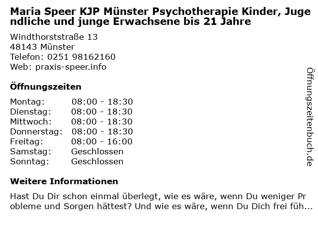 Branchen & Suchbegriffe zu Maria Speer KJP Münster Psychotherapie Kinder, Jugendliche und junge Erwachsene bis 21 Jahre:21, bis, erwachsene, hypnosetherapie, jahre, jugendliche, junge, kinder, kjp, maria, nachhilfedienst, psychologie, psychologische beratung, psychotherapie, speer |