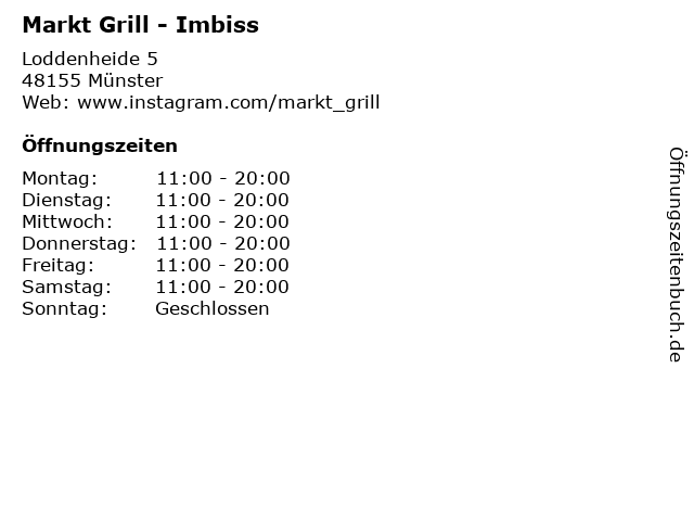 | Öffnungszeiten Markt Grill - Imbiss in Münster anzeigen | |