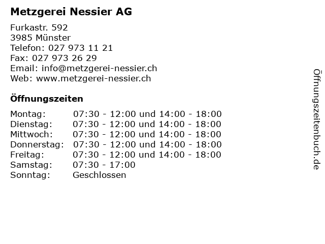 | Öffnungszeiten Metzgerei Nessier AG in Münster anzeigen | |