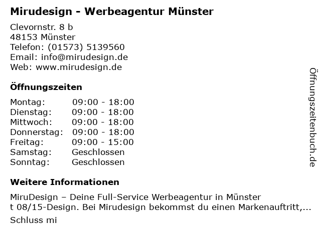 5 bikinikillers - corporate design & marketing (Entfernung: 1,17 km) Nieberdingstrasse 13, 48155 Münster 6 bikinikillers - grafikgestaltung & mediendesign (Entfernung: 1,18 km) Nieberdingstraße 13, 48155 Münster |