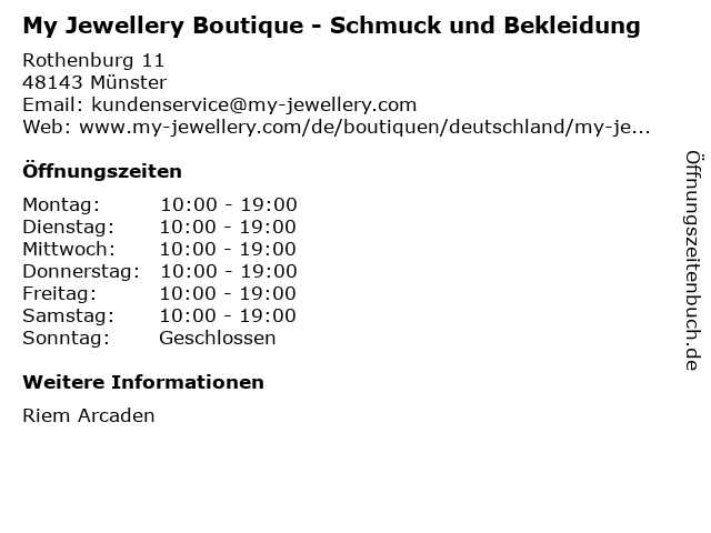 | Öffnungszeiten My Jewellery Boutique - Schmuck und Bekleidung in Münster anzeigen | |