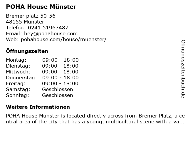 | Öffnungszeiten POHA House Münster in Münster anzeigen | |