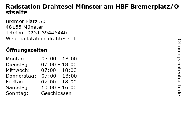 Branchen & Suchbegriffe zu Radstation Drahtesel Münster am HBF Bremerplatz/Ostseite:bremerplatz/ostseite, drahtesel, hbf, parkhaus, radstation, reparaturservice für fahrräder |