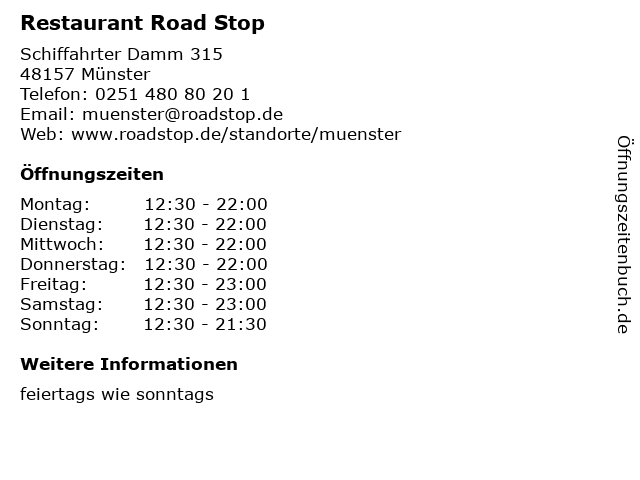 Öffnungszeiten Restaurant Road Stop in Münster anzeigen | |