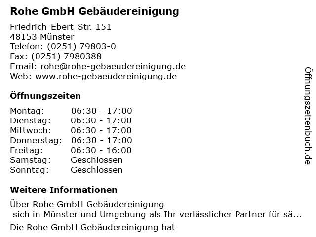 | Öffnungszeiten Rohe GmbH Gebäudereinigung in Münster anzeigen | |