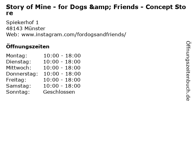 | Öffnungszeiten Story of Mine - for Dogs & Friends - Concept Store in Münster anzeigen | |