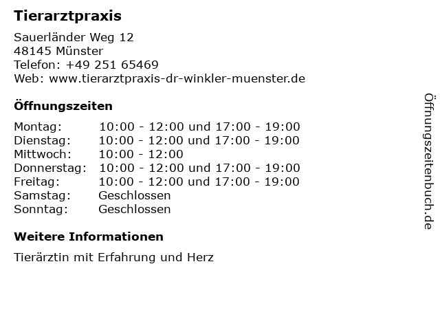 | Öffnungszeiten Tierarztpraxis in Münster anzeigen | |
