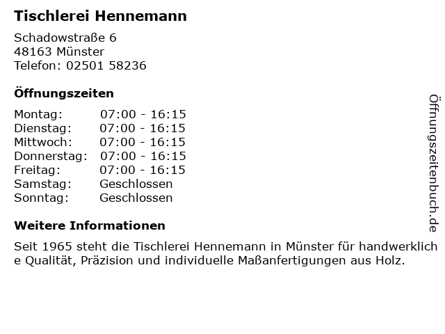 | Öffnungszeiten Tischlerei Hennemann in Münster anzeigen | |