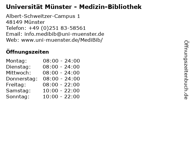 1 Universitäts- und Landesbibliothek Münster - Zweigbibliothek Medizin (ZBMed) - Auskunft (Entfernung: 0,24 km) Albert-Schweitzer-Campus 1, 48149 Münster 2 Akademie für Manuelle Medizin - Physiotherapie (Entfernung: 0,57 km) von-Esmarch-Str. 50, 48149 Münster 4 5 Westfälische Schule für Musik der Stadt Münster - Leihinstrumente / Bibliothek (Entfernung: 0,99 km) Himmelreichallee 50, 48149 Münster 6 Universität Münster - Bibliothek Geowissenschaften I (Entfernung: 1,00 km) Heisenbergstr. 2, 48149 Münster |