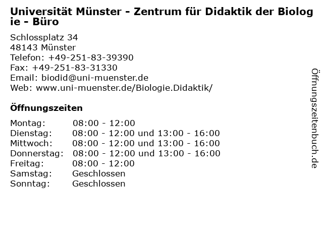 Branchen & Suchbegriffe zu Universität Münster - Zentrum für Didaktik der Biologie - Büro:biologie, büro, didaktik, geschäfts, institut, universität, zentrum, zimmer |