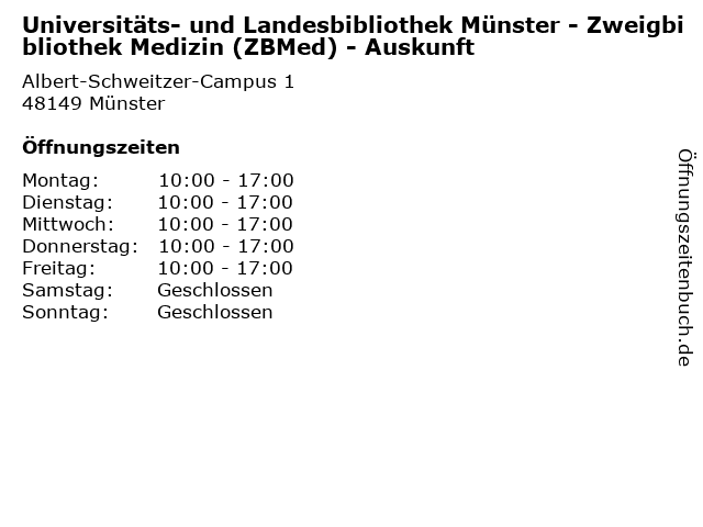 Branchen & Suchbegriffe zu Universitäts- und Landesbibliothek Münster - Zweigbibliothek Medizin (ZBMed) - Auskunft:auskunft, bibliothek, bücher, landesbibliothek, medizin, service, ulb, universitäts, universitätsbibliothek, zbmed, zweigbibliothek |