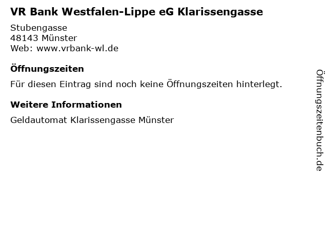 | Öffnungszeiten VR Bank Westfalen-Lippe eG Klarissengasse in Münster anzeigen | |