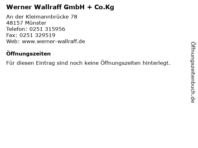 | Öffnungszeiten Werner Wallraff GmbH + Co.Kg in Münster anzeigen | |