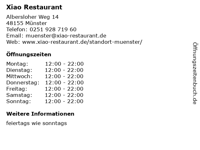 | Öffnungszeiten Xiao Restaurant in Münster anzeigen | |