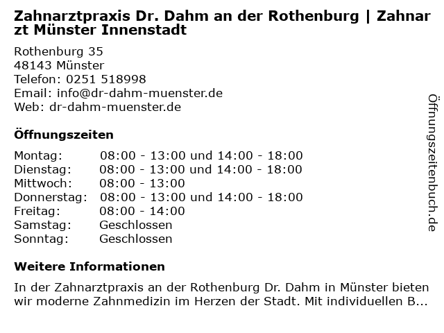Branchen & Suchbegriffe zu Zahnarztpraxis Dr. Dahm an der Rothenburg | Zahnarzt Münster Innenstadt:an, dahm, dr., endodontie, innenstadt, kinderzahnheilkunde, kosmetische zahnbehandlung, parodontologie, parodontologie für zahnimplantate, zahnarzt, zahnarztpraxis, zahnaufhellung, zahnersatz |