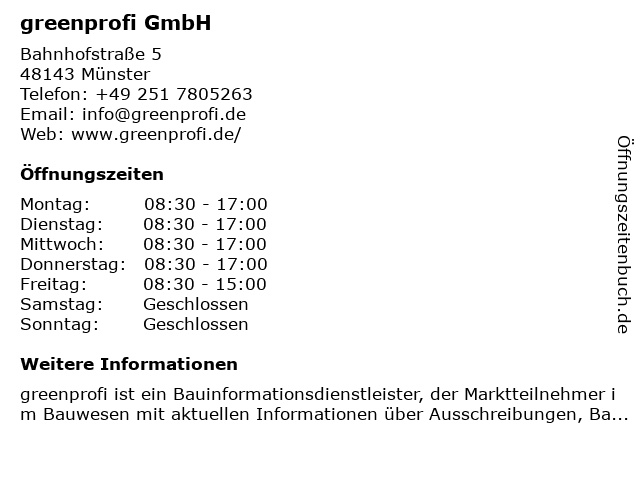 | Öffnungszeiten greenprofi GmbH in Münster anzeigen | |