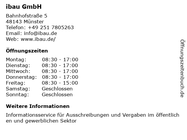 | Öffnungszeiten ibau GmbH in Münster anzeigen | |
