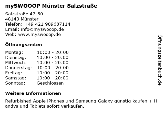 Öffnungszeiten mySWOOOP Münster Salzstraße in Münster anzeigen | |