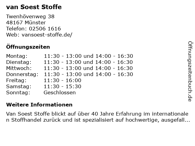 | Öffnungszeiten van Soest Stoffe in Münster anzeigen | |