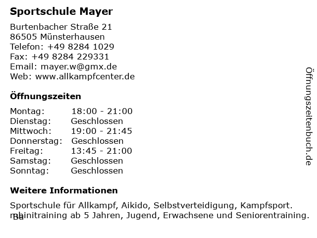 | Öffnungszeiten Sportschule Mayer in Münsterhausen anzeigen | |