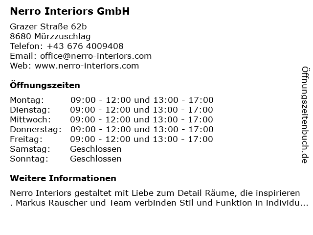 | Öffnungszeiten Nerro Interiors GmbH in Mürzzuschlag anzeigen | |