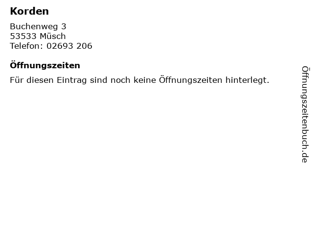 | Öffnungszeiten Korden in Müsch anzeigen | |