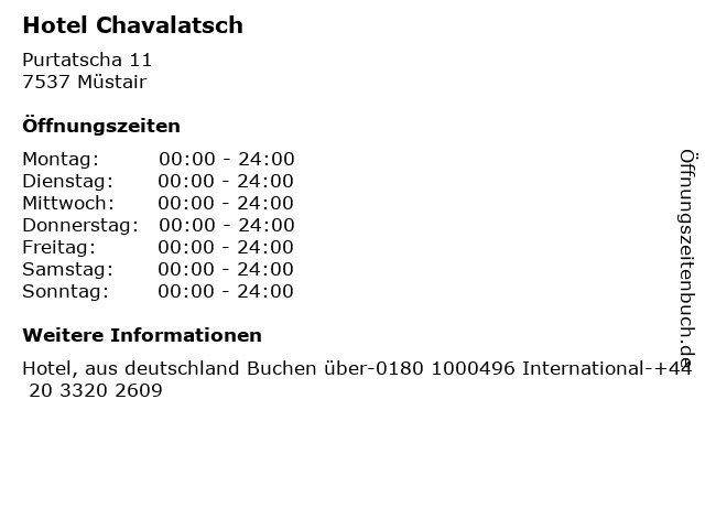 | Öffnungszeiten Hotel Chavalatsch in Müstair anzeigen | |