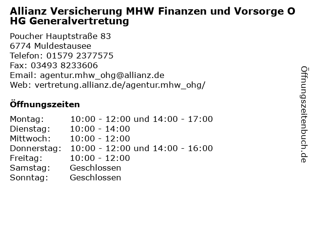 3 Allianz Generalvertretung Renzo Wernicke (Entfernung: 9,20 km) Zörbiger Str. 11, 06792 Sandersdorf-Brehna 4 5 Allianz Versicherung Jörg Wenke Generalvertretung (Entfernung: 11,25 km) Rudolf-breitscheid-straße 24, 04509 Delitzsch 6 Mecklenburgische Versicherungsgruppe - Generalvertretung Marina Böttcher (Entfernung: 12,11 km) August-Bebel-Straße 25, 06773 Gräfenhainichen |