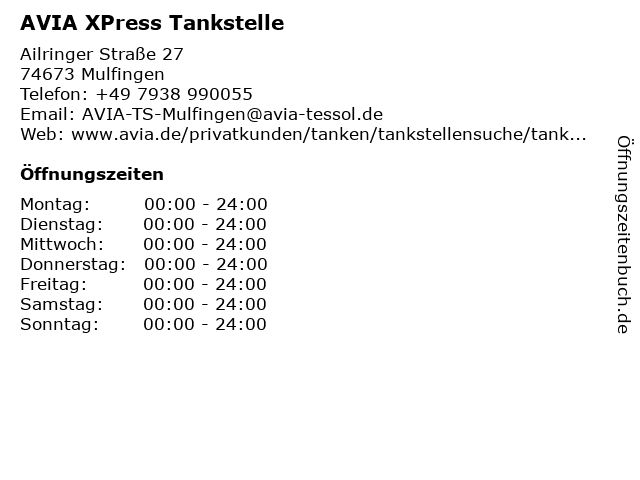 | Öffnungszeiten AVIA XPress Tankstelle in Mulfingen anzeigen | |