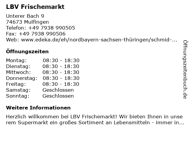 | Öffnungszeiten LBV Frischemarkt in Mulfingen anzeigen | |
