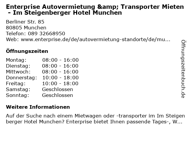 Branchen & Suchbegriffe zu Enterprise Autovermietung & Transporter Mieten - Im Steigenberger Hotel Munchen:autovermietung, enterprise, hotel, mieten, munchen, steigenberger, transporter |