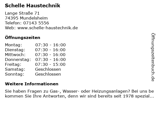 | Öffnungszeiten Schelle Haustechnik in Mundelsheim anzeigen | |