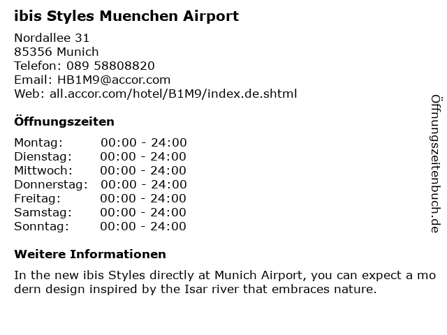 | Öffnungszeiten ibis Styles Muenchen Airport in Munich anzeigen | |