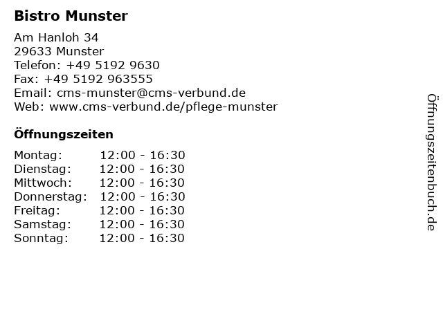 | Öffnungszeiten Bistro Munster in Munster anzeigen | |
